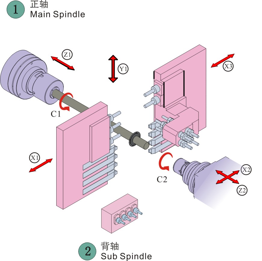 8、三通道控制方式,主軸端雙X軸控制兩把刀具同時(shí)與工件接觸,可實(shí)現(xiàn)兩側(cè)同時(shí)銑面、車削、打孔工藝,大大節(jié)省了加工效率。