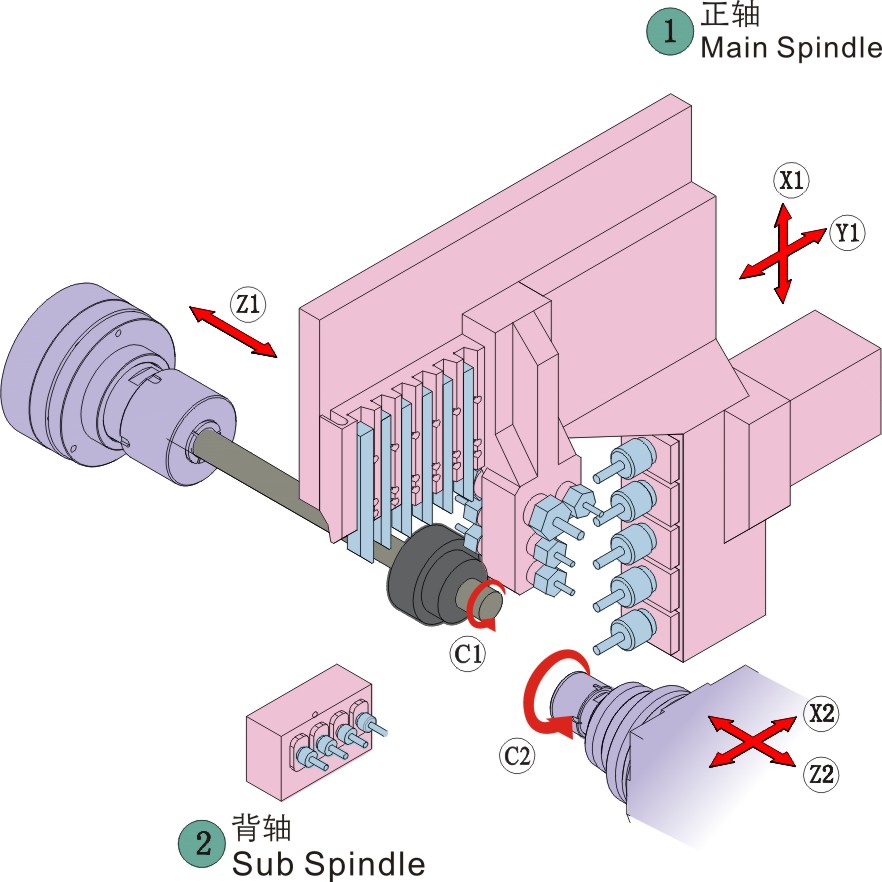 雙主軸走心機(jī)主/副軸標(biāo)配C軸任意分度定位,功能齊全不套路;主軸側(cè)面動(dòng)力頭5孔位/副軸4孔位支持拔插拓展功能;標(biāo)配切斷檢測(cè)功能。